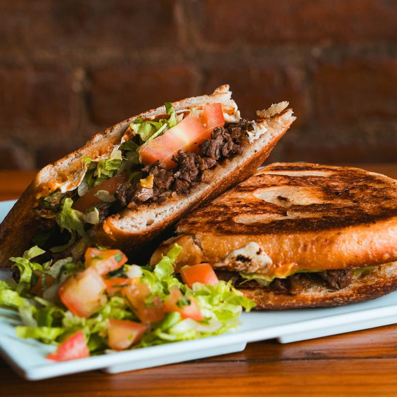 Grilled marinated choice steak with melted Jack cheese in a toasted 12" flour tortilla. Add guac, sour cream, salsa for an extra charge